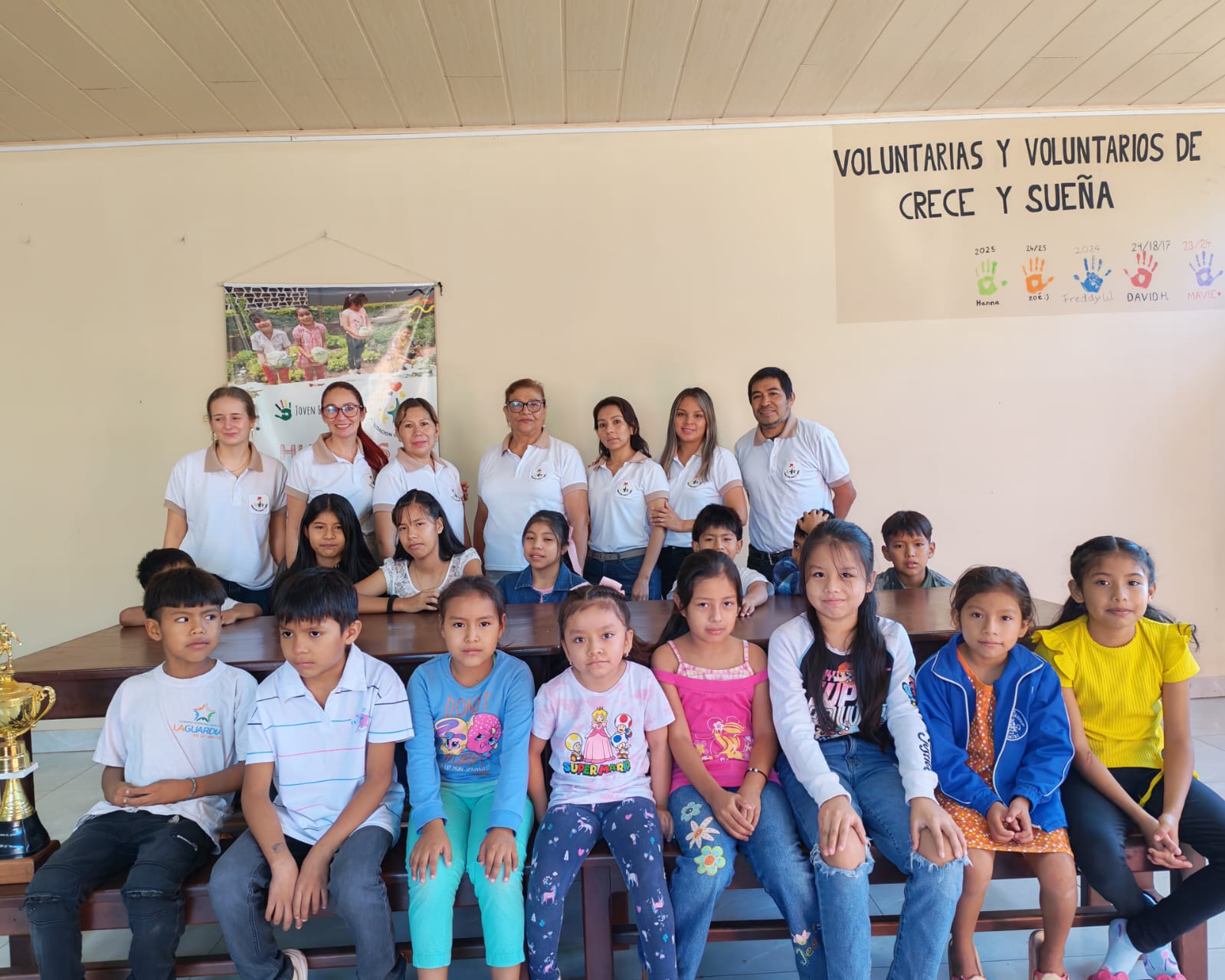 Wie jedes Jahr gab es dann eine Live-Schalte per Zoom nach Bolivien. Doña Margot, unsere Projektleiterin vor Ort, führte gemeinsam mit Tatja – der aktuellen Freiwilligen – durch das Haus und das Grundstück. Einige Kinder waren ebenfalls dabei, winkten in die Kamera und zeigten stolz ihre Pokale vom Fußballturnier des vergangenen Jahres. Auch die neuen Lehrkräfte stellten sich kurz vor.
