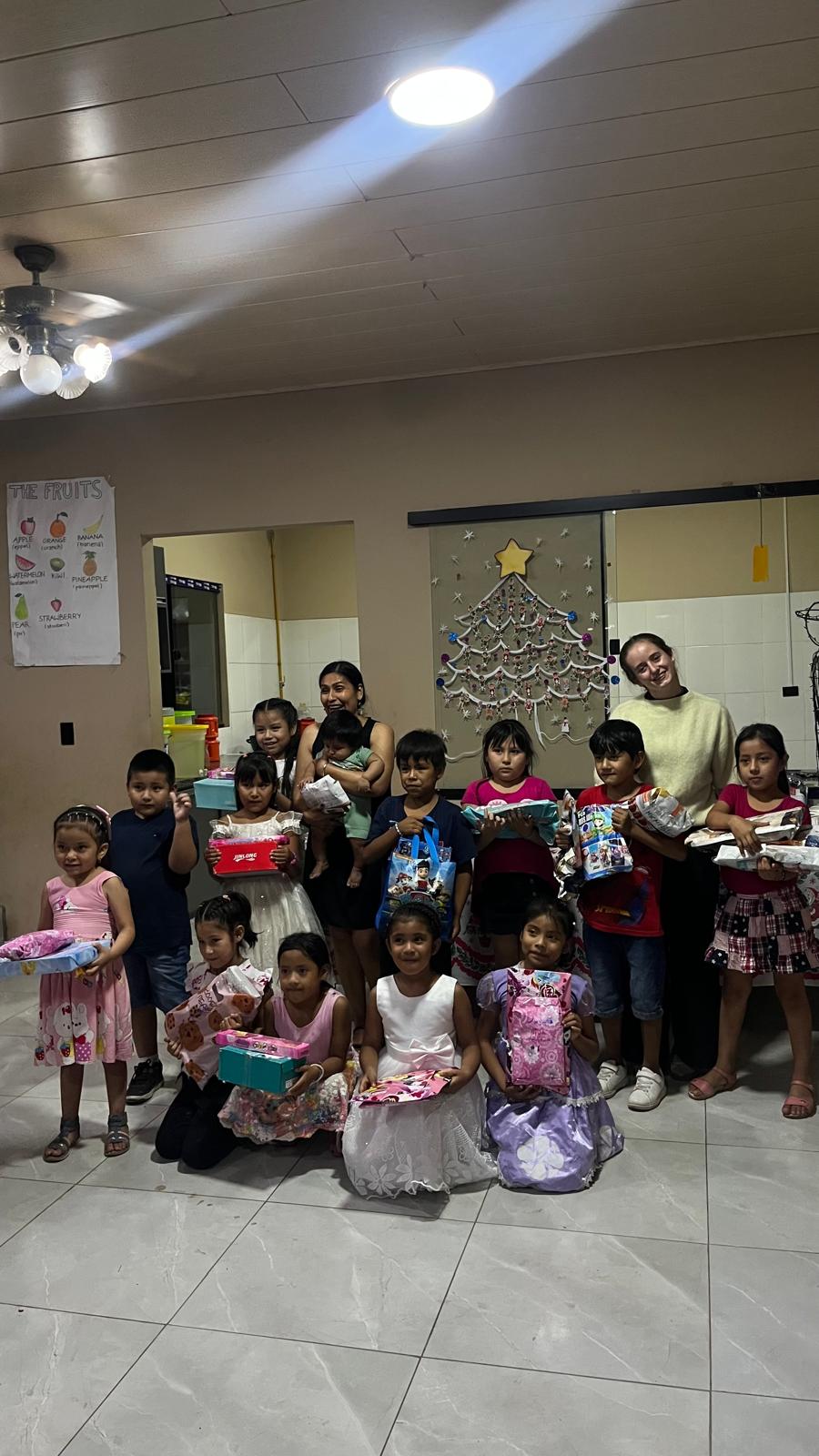 Gegen 17:30 Uhr kamen die Kinder – festlich gekleidet, geschniegelt, gestriegelt und voller Vorfreude. Es wurde getanzt, gelacht und gerätselt, bevor das gemeinsame Essen begann: chancho al horno, Hähnchen, Reis, Salat und vieles mehr. Nachdem die Kinder ihre Teller abgewaschen hatten, folgte die Bescherung. Jedes Kind erhielt ein Geschenk, manche sogar zusätzlich etwas für ihre Geschwister.