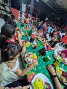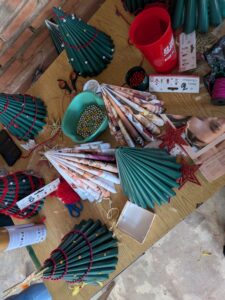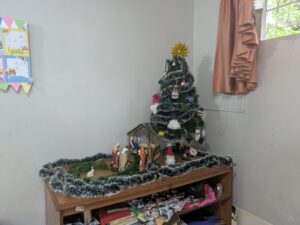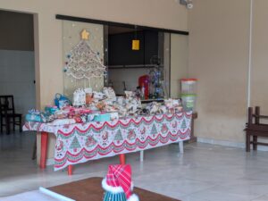 Die Weihnachtsfeier selbst war ein ganz besonderer Moment. Am Nachmittag schmückten die Profes den Raum, deckten die Tische und bereiteten den Gabentisch vor, während die Köchinnen bereits seit dem Mittag das Festessen zubereiteten. Auch für die Mütter, die regelmäßig die vorbereiten, wurden Körbe mit Lebensmitteln gepackt.